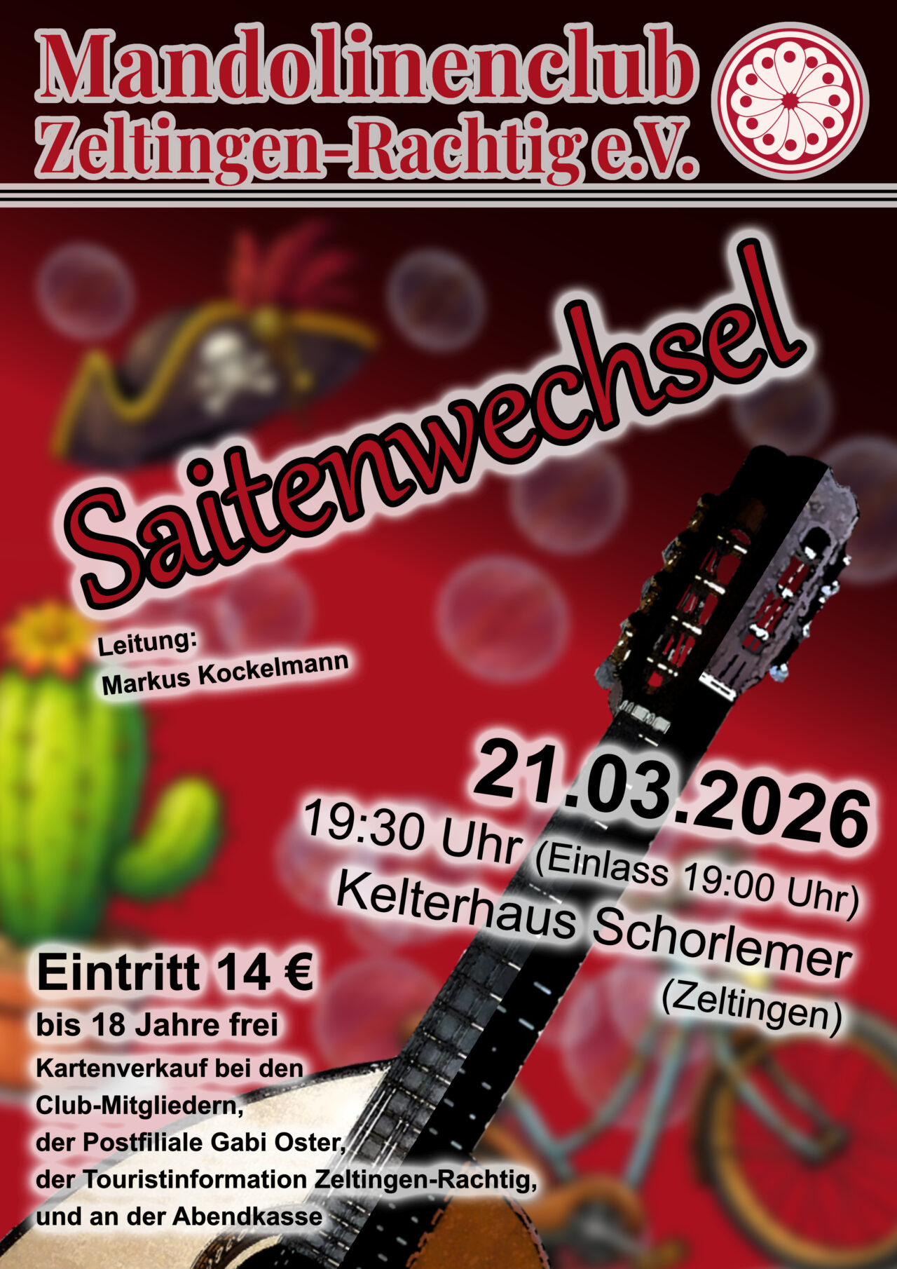 Saitenwechsel in Zeltingen-Rachtig: Mandolinenclub lädt zum Premierenkonzert Unter dem Titel „Saitenwechsel“ lädt der Mandolinenclub Zeltingen-Rachtig e.V. am Samstag, 21. März 2026 um 19:30 Uhr zu einem besonderen Konzertabend ins Kelterhaus Schorlemer ein. Nach dem Stabwechsel am Dirigentenpult präsentiert sich das Orchester erstmals unter der Leitung von Markus Kockelmann. Für den…